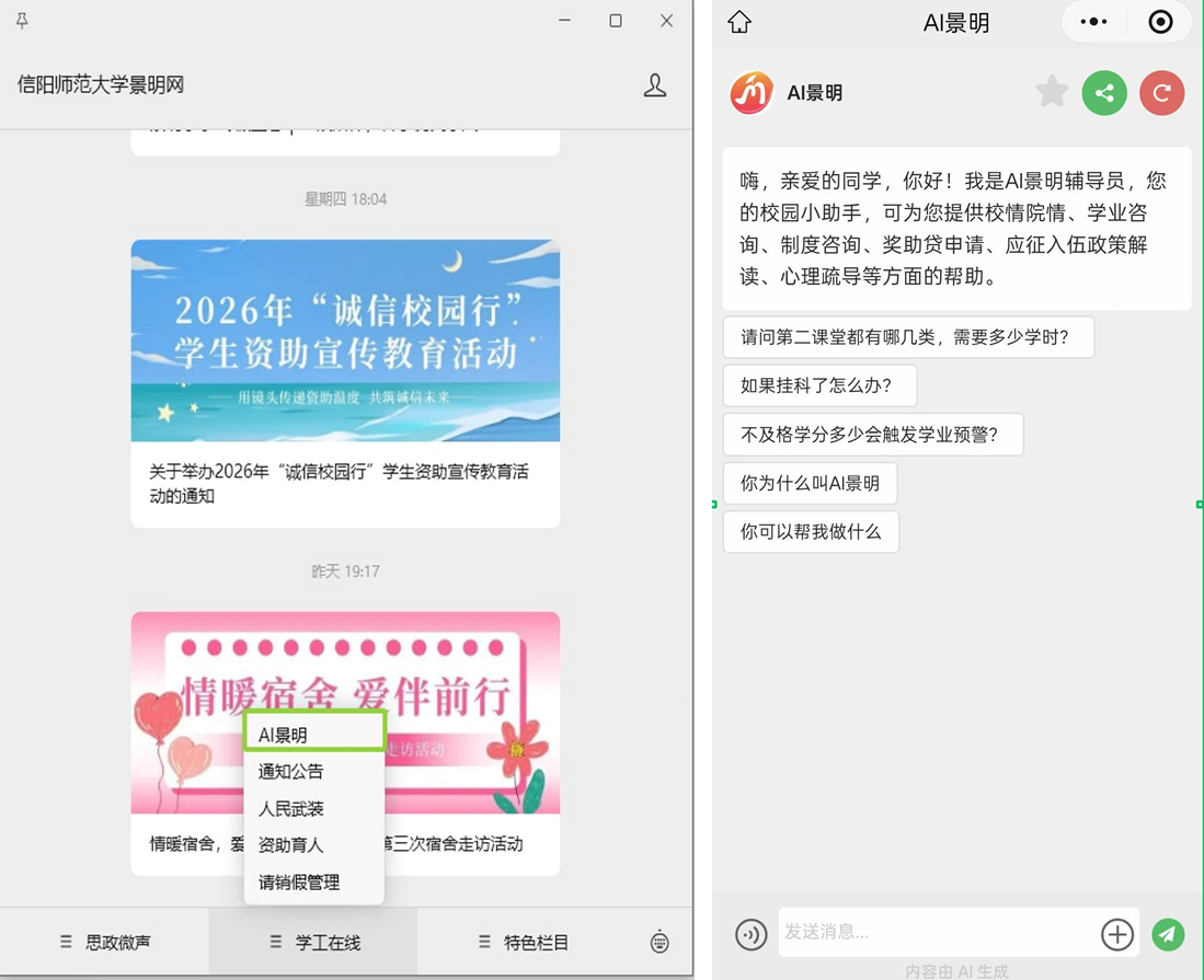 时间:2026-04-13 来源: 作者: 阅读: 次在学校相关部门大力支持下,经过前期试运行测试,我校研制的思政教育智能体“AI景明”于本月进入正式运行阶段。师生可通过“信阳师范大学景明网”微信公众号“学工在线”导航栏直达“AI景明”进行使用。